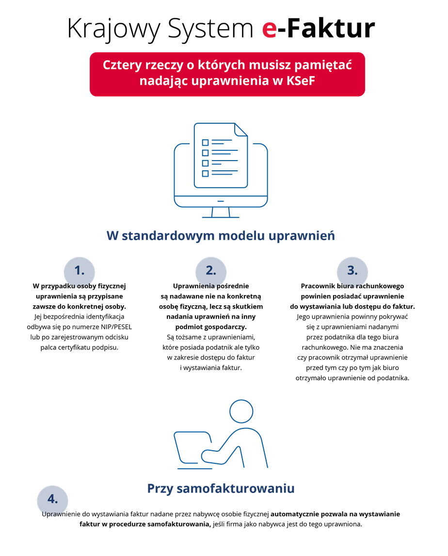 Jedna osoba może otrzymać pełen zakres uprawnień. W zależności od zakresu realizowanych zadań dopuszczalne jest również rozdzielenie uprawnień na kilka osób. Tym samym część osób może otrzymać uprawnienie tylko do dostępu do faktur. Inna grupa może mieć dodatkowo możliwość wystawiania faktur. Jeszcze inna może mieć również prawo do nadawania, zmiany lub odbierania uprawnień. Wszystko zależy od modelu organizacji pracy w firmie i jej wielkości.